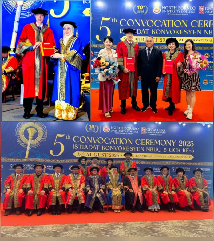 KOTA KINABALU: It was a double honour for the mother-and-son duo, Malaysian property developer Datuk Susan Wong Siew Guen, who was appointed as a member of the Board of Directors of North Borneo University College (NBUC) and her son, Jonathan Wong, who was conferred the Adjunct Professorship in Business Management, at the fifth convocation ceremony of the institution here yesterday.