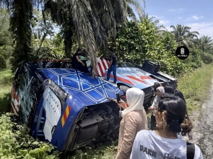 In the incident that occurred around 11:40 AM, a Scania bus owned by Amin Jaya, which was travelling from Kota Kinabalu to Semporna, lost control and veered off to the side of the road.