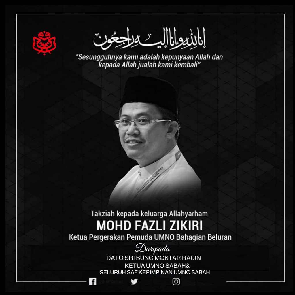 KOTA KINABALU : Ketua Umno Sabah Dato’ Sri Bung Moktar Radin bersama seluruh kepimpinan dan ahli merakamkan ucapan takziah kepada keluarga Ketua Pergerakan Pemuda UMNO Bahagian Beluran, Mohd Fazli Zikiri yang meninggal dunia di salah sebuah hospital swasta di sini kira-kira 2.30 petang tadi.