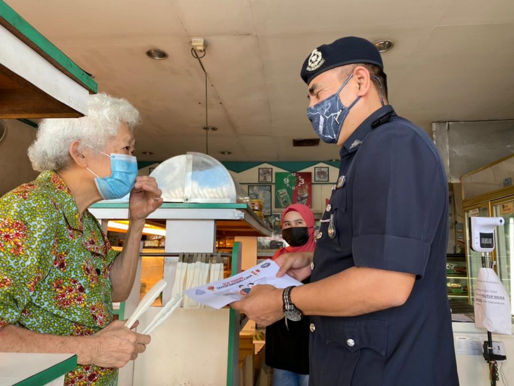 Ketua Polis Daerah Tuaran DSP Mohd Hamizi Halim menyerahkan risalah berkenaan SOP yang ditetapkan kepada seorang warga Tionghua.
