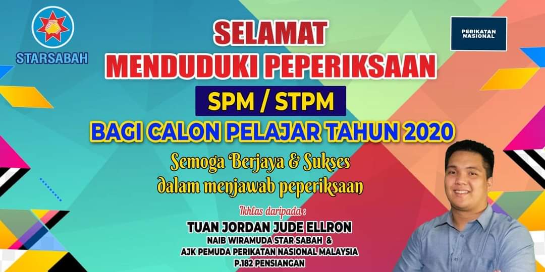 Naib Ketua Wiramuda Star Sabah Jordan Jude Ellron mengucapkan selamat berjaya kepada pelajar-pelajar tingkatan lima yang bakal menduduki peperiksaan Sijil Pelajaran Malaysia (SPM) bermula 22 Februari ini.