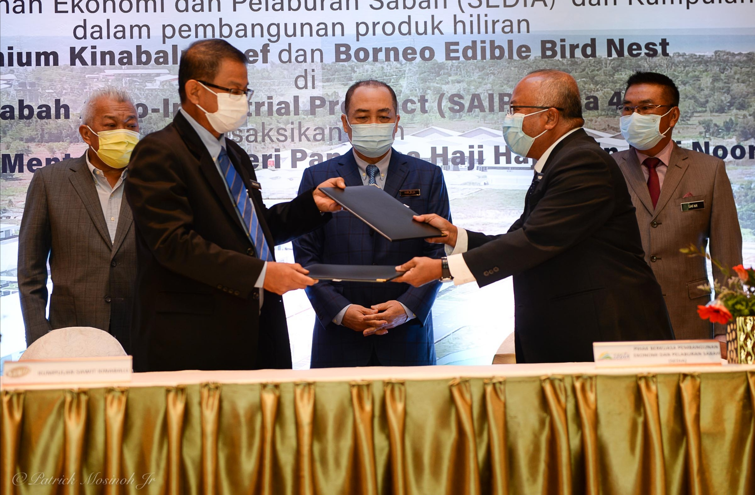 After the meeting Hajiji witnessed the Memorandum of Understanding (MoU) signing ceremony between Sedia and Sawit Kinabalu for the setting up of the beef and bird nest production plants in SAIP.