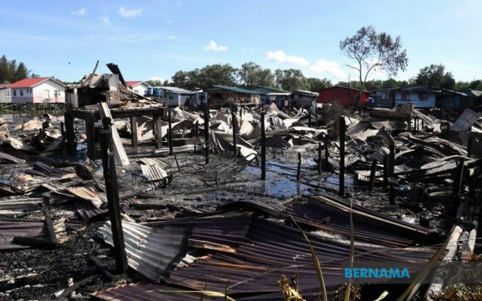 KOTA KINABALU: Seramai 221 orang daripada 45 keluarga hilang tempat tinggal apabila 35 rumah atas air di Meruntum, Putatan musnah dalam kebakaran, petang semalam.