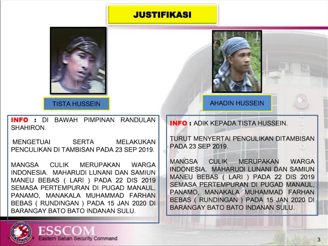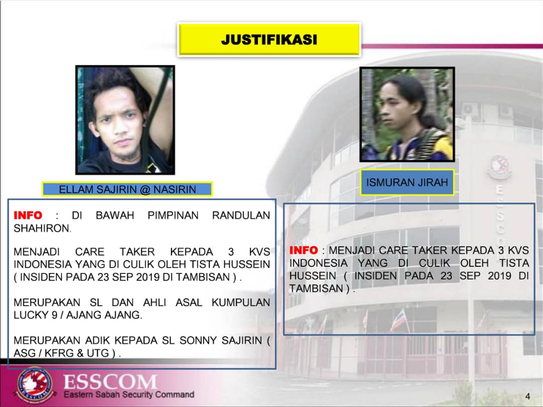 LAHAD DATU: Kawasan Keselamatan Khas Pantai Timur Sabah (ESSCOM) memasukkan empat suspek warga asing dalam senarai yang dikehendaki kerana terbabit jenayah rentas sempadan di perairan Zon Selamat Timur Sabah (ESSZONE).
