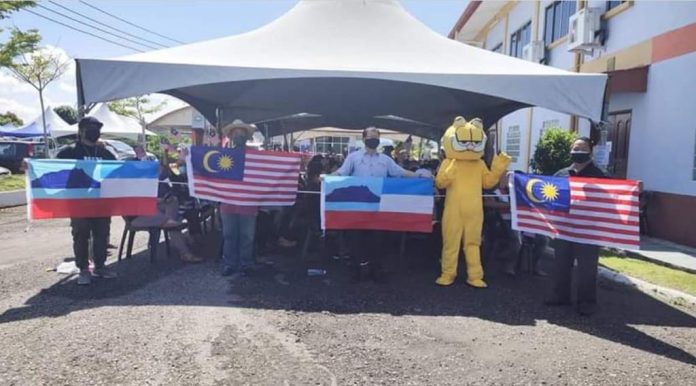 PAPAR: Ribuan peserta program vaksinasi dos kedua bagi kawasan DUN Limbahau meraihkan Bulan Kemerdekaan sambil mengibarkan jalur gemilang dan bendera Sabah di Dewan Serbaguna Mositun, dekat sini semalam.