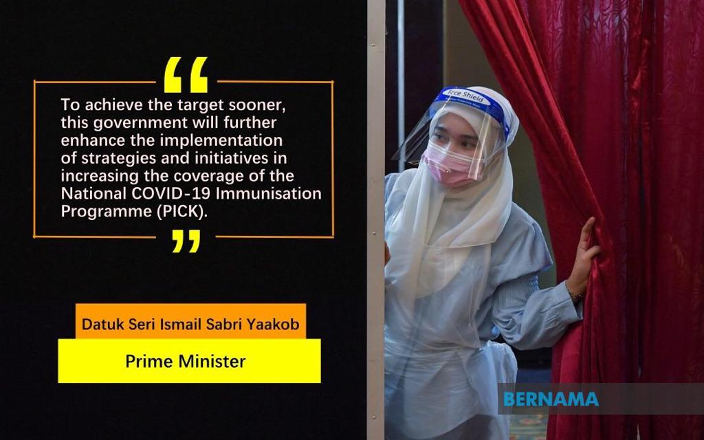 “To achieve the target sooner, this government will further enhance the implementation of strategies and initiatives in increasing the coverage of the National COVID-19 Immunisation Programme (PICK),” he said in his maiden speech as Prime Minister, today.