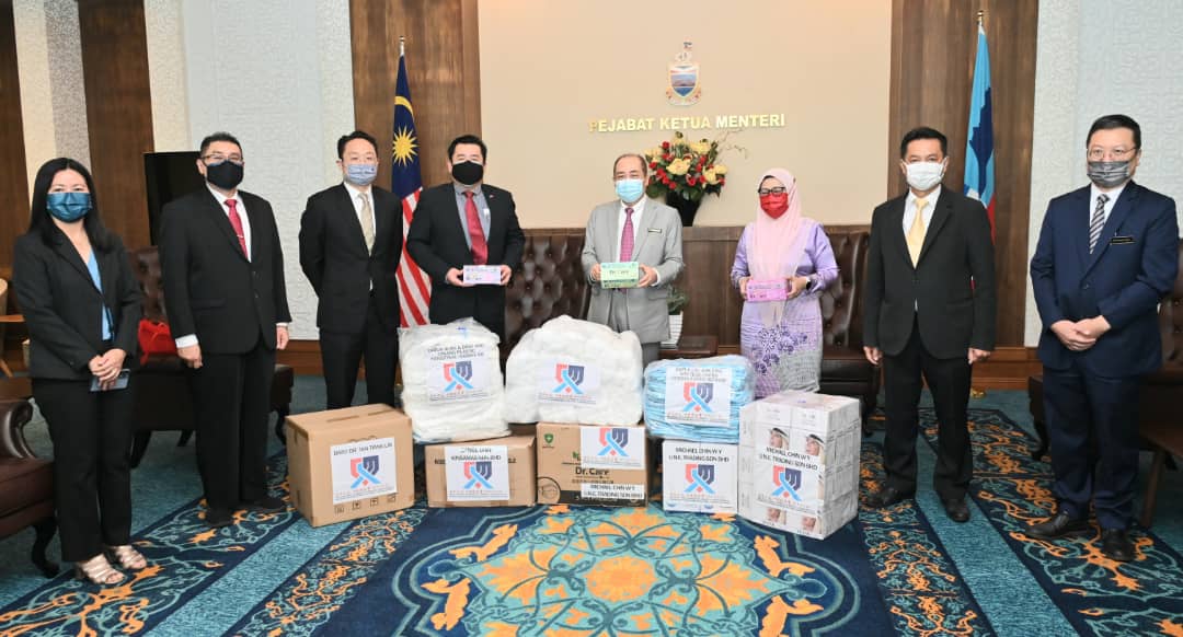 OTA KINABALU: Ketua Menteri, Datuk Seri Panglima Haji Hajiji Haji Noor hari ini menerima sumbangan peralatan perlindungan diri (PPE) daripada 2 organisasi untuk petugas barisan hadapan (frontliners), di pejabatnya di Pusat Pentadbiran Negeri Sabah (PPNS), hari ini.