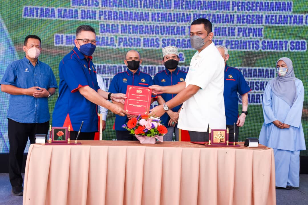 PASIR PUTEH: Lembaga Kemajuan Pertanian Kemubu (KADA) hari ini menandatangani Memorandum Persefahaman (MoU) dengan Syarikat Padi Beras Nasional Berhad (BERNAS) bagi pelaksanaan Projek Smart Sawah Berskala Besar (SMART SBB) yang merupakan salah satu program peningkatan hasil padi negara, pada satu majlis yang diadakan di Ladang Merdeka Jelor, Pasir Puteh.