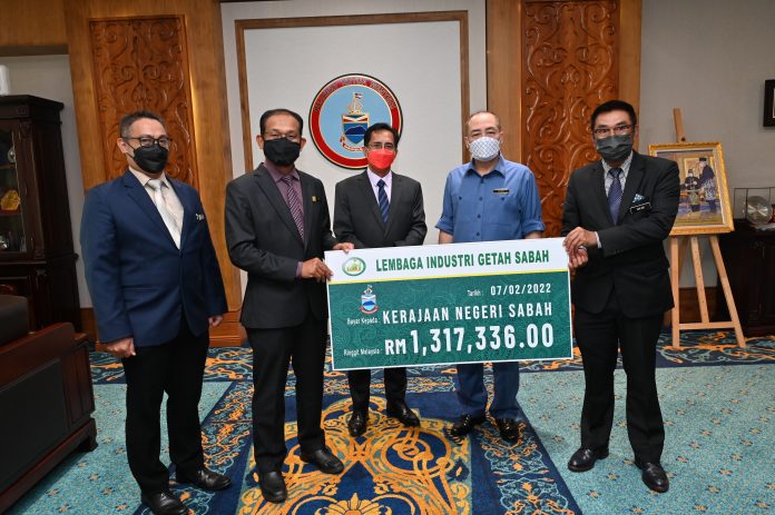 KOTA KINABALU: Ketua Menteri, Datuk Seri Panglima Haji Hajiji Haji Noor menyaksikan penyerahan dividen daripada Lembaga Industri Getah Sabah (LIGS) sebanyak RM1,317,336.00 kepada Kerajaan Negeri di pejabatnya di Menara Kinabalu, hari ini.