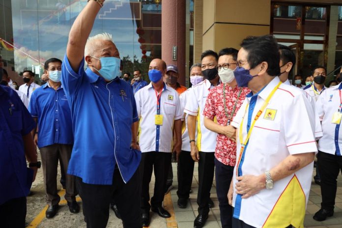KOTA KINABALU: Ketua Umno Sabah Datuk Seri Panglima Bung Moktar Radin mengiringi Pengerusi Barisan Nasional yang juga Presiden Umno Dato Sri Dr. Ahmad Zahid Hamidi merasmikan Mesyuarat Perwakilan Tri Tahunan Parti Bersatu Rakyat Sabah (PBRS) ke-3 bertempat Di dewan Hakka Jalan Tanjung Lipat Likas pada Sabtu.