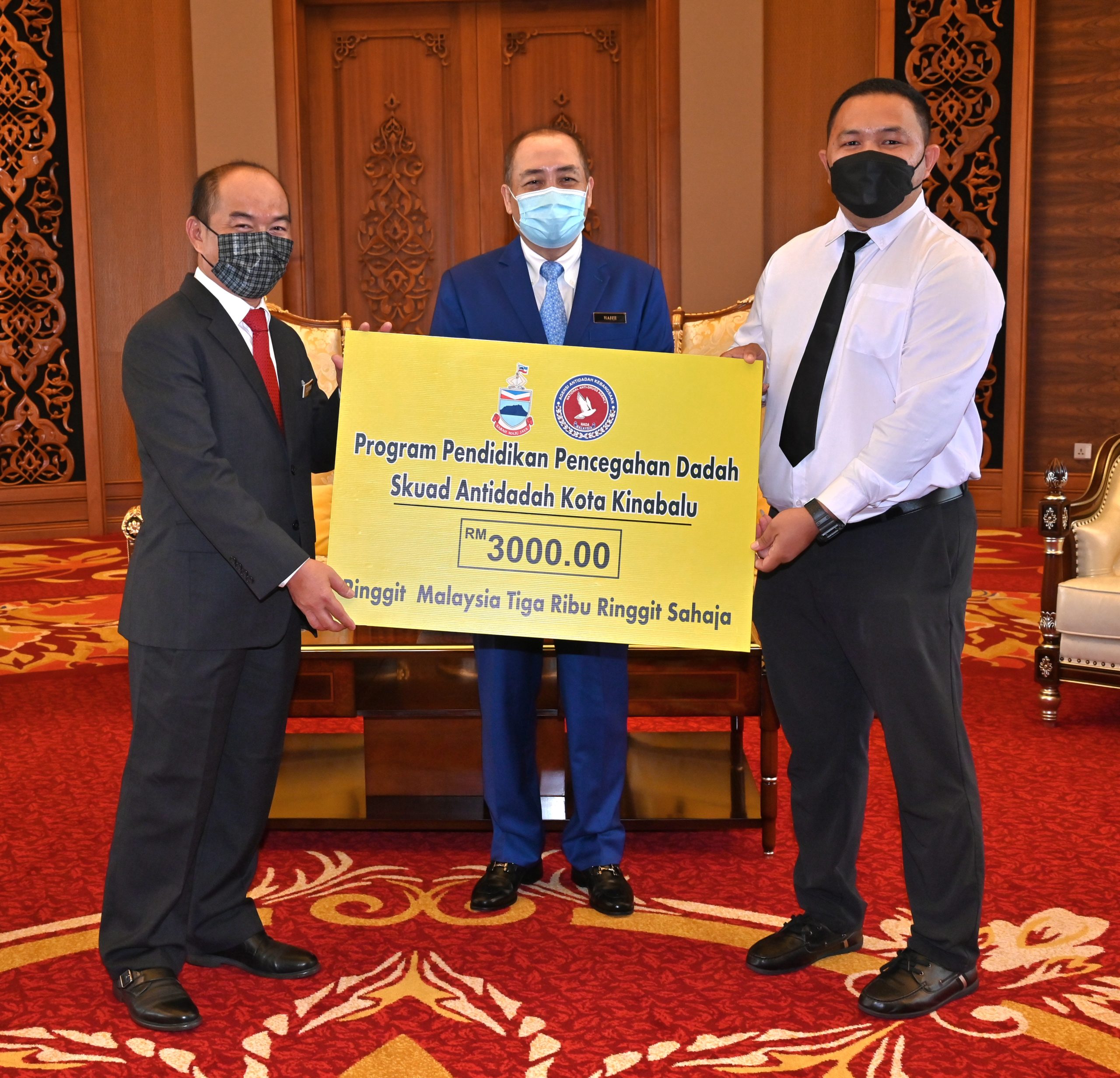 Ketua Menteri, Datuk Seri Panglima Haji Hajiji Haji Noor menyaksikan penyerahan replika cek sumbangan itu daripada Ketua Pengarah Agensi Anti Dadah Kebangsaan (AADK), Encik Sutekno Ahmad Belon kepada pemimpin NGO’s di pejabatnya di Menara Kinabalu, hari ini.