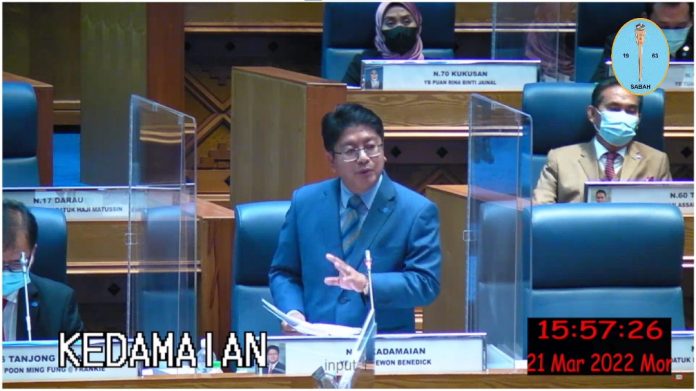 KOTA KINABALU: Ahli Dewan Undangan Negeri (ADUN) Kadamaian Datuk Ewon Benedick menyatakan sidang Dewan Undangan Negeri Sabah hari ini terlepas peluang bagi membuat ketetapan menolak tuntutan Sulu atau Filipina ke atas Sabah dan memperkukuhkan Ketua Menteri yang telah menyatakan tidak mengiktiraf tuntutan tersebut.