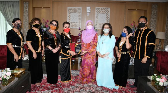 KOTA KINABALU: Isteri Ketua Menteri, Datin Seri Panglima Hajah Juliah Salag menerima kunjungan hormat daripada Pengerusi Unduk Ngadau kaamatan Peringkat Negeri Sabah, Puan Joanna Datuk Kitingan, di kediaman rasmi Ketua Menteri di Rumah Yayasan Sabah, di Kota Kinabalu pada Selasa.