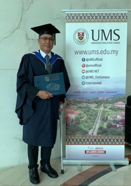 KOTA KINABALU: Graduan Orang Kurang Upaya (OKU) dan pejuang kanser, Rosdy Latif, 44, berjaya menggenggam Ijazah Sarjana Muda Sains Sosial dengan Kepujian (Komunikasi) di Majlis Konvokesyen Universiti Malaysia Sabah (UMS) ke-23, kelmarin.