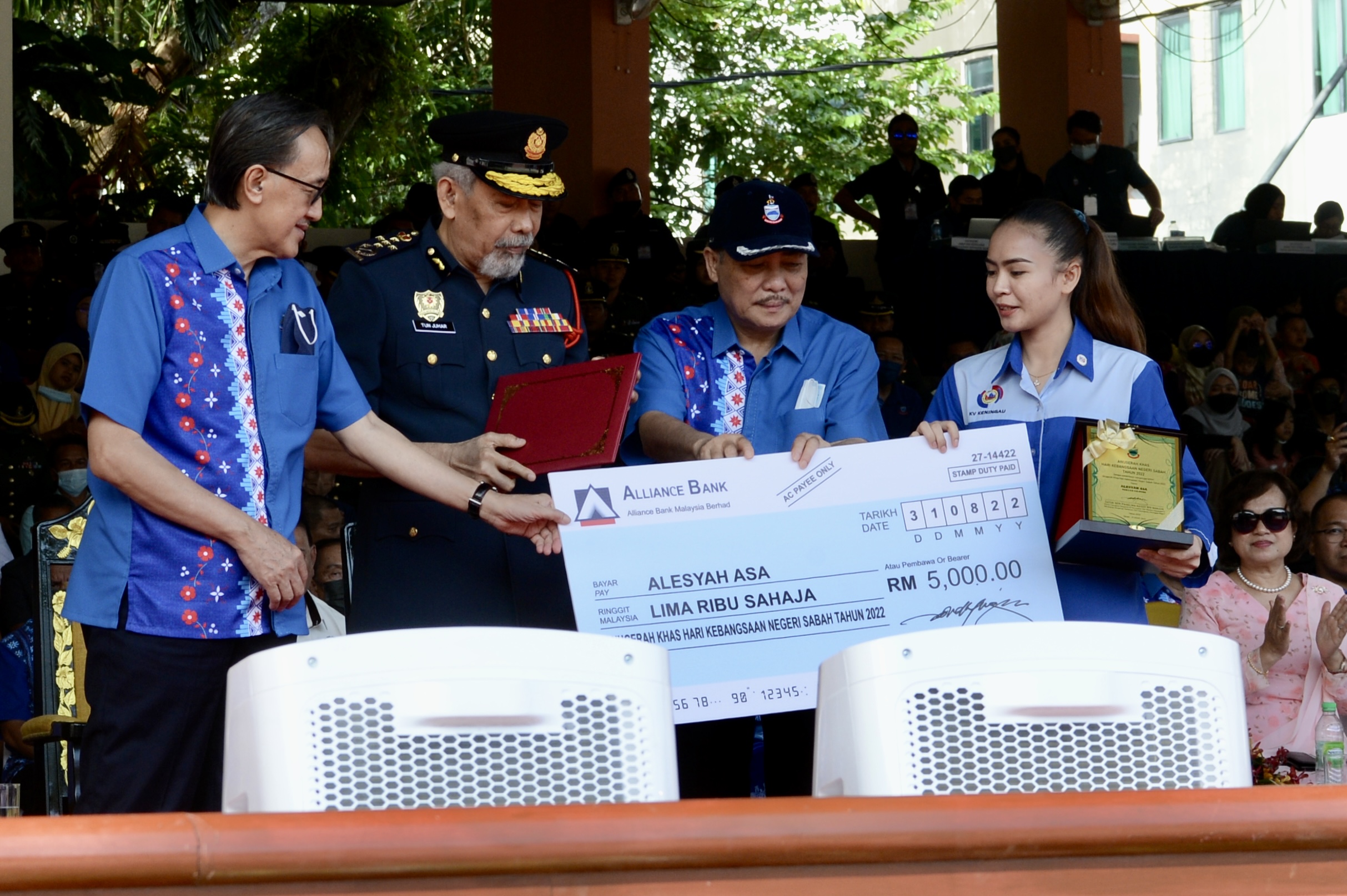 KOTA KINABALU: Yang di-Pertua Negeri Sabah, Tun Datuk Seri Panglima Haji Juhar Mahiruddin menyampaikan Anugerah Khas Hari Kebangsaan kepada Alesyah Asa sambil diperhatikan oleh Ketua Menteri Datuk Seri Panglima Haji Hajiji Haji Noor ketika upacara Perbarisan Hari Kebangsaan yang diadakan di Padang Merdeka pada Rabu.Alesyah, 20, pelajar jurusan teknologi pembinaan Kolej Vokasional Keningau, Sabah merupakan satu-satunya pelajar Malaysia yang terpilih sebagai salah seorang calon 50 pelajar terbaik bagi anugerah Global Student Prize 2022.