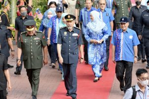 Yang di-Pertua Negeri Sabah, Tun Datuk Seri Panglima Haji Juhar Mahiruddin Tun Juhar dan Ketua Menteri, Datuk Seri Panglima Haji Hajiji Haji Noor menyaksikan lintas hormat kontijen perbarisan sempena upacara Perbarisan Hari Kebangsaan 2022 di Padang Merdeka, pada Rabu.