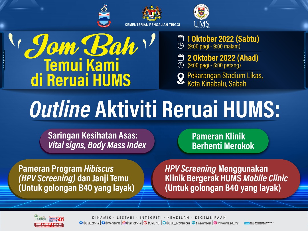 KOTA KINABALU – Hospital Universiti Malaysia Sabah (HUMS) menjemput orang ramai untuk berkunjung ke reruai HUMS yang akan berada di perkarangan Stadium Likas Kota Kinabalu pada 1 dan 2 Oktober 2022 bersempena Program ‘Kita Demi Negara’ Zon Sabah.
