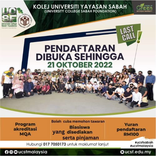 KOTA KINABALU: Pelajar di negeri ini dialu-alukan untuk melanjutkan pengajian di University College Sabah Foundation (UCSF) atau Kolej Universiti Yayasan Sabah sama ada di peringkat diploma atau ijazah sarjana muda tahun ini.