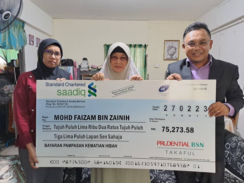 Mujurlah dengan berkat kerja keras dan komitment yang ditunjukkan oleh Perunding Kewangan PruBSN Takaful Encik Mohd Aziz Bin Marinsah dari Abdullah Associates, segala urusan pembayaran pampasan dapat dipermudahkan.