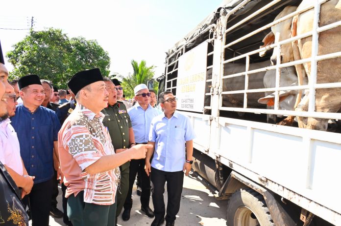 TUARAN: Ketua Menteri Datuk Seri Panglima Haji Hajiji Haji Noor menyerahkan sumbangan sebanyak 147 ekor lembu korban kepada masjid, surau, jabatan dan agensi kerajaan serta pertubuhan bukan kerajaan (NGO) untuk ibadah korban pada Hari Raya Aidiladha tahun ini.