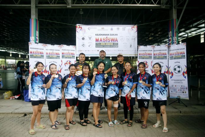 KOTA KINABALU: Cyberjaya College Kota Kinabalu dan Almacrest International College masing-masing meraih emas pertama acara Futsal Lelaki dan Wanita Kejohanan Sukan Antara Institusi Pendidikan Tinggi Swasta (IPTS) (Sukan MASISWA) Zon Sabah 2023.