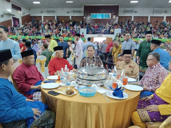SIPITANG: Majlis Rumah Terbuka Hari Raya Aidilfitri Daerah Sipitang dimeriahkan dengan kehadiran ramai tetamu termasuk yang bukan beragama Islam di Dewan Serbaguna Sipitang, semalam.
