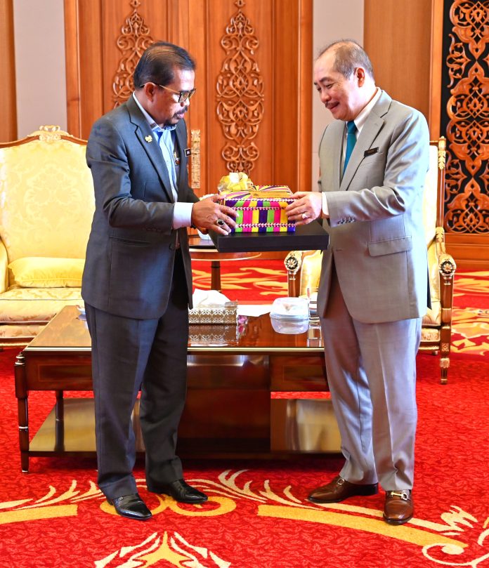 KOTA KINABALU: Ketua Menteri, Datuk Seri Panglima Haji Hajiji Haji Noor menerima kunjungan hormat daripada Presiden Kongres Kesatuan Pekerja-pekerja Di Dalam Perkhidmatan Awam (CUEPACS), Dato Dr Haji Adnan Mat di pejabatnya di Menara Kinabalu pada Khamis.