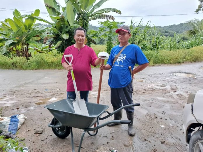 TAMPARULI: Ketua Pergerakan Pemuda Parti Bersatu Sabah (PBS) Bahagian N.14 Tamparuli, Rizkam Wenddy Yabin menyumbangkan peralatan asas pembersihan tanah kepada seorang penduduk di Kampung Wangkod, hari ini.