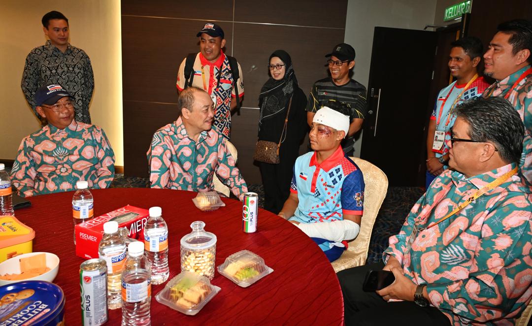 KUCHING: Ketua Menteri, Datuk Seri Panglima Haji Hajiji Haji Noor meluangkan masa melawat atlit berbasikal Sabah, Akmal Thaqif Begurdy yang mengalami kecederaan semasa menyertai Sukan Malaysia (SUKMA) XXI Sarawak 2024 di Riversite Majestic Hotel pada Sabtu.