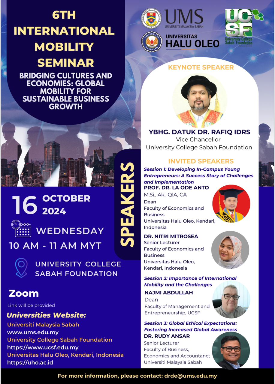 KOTA KINABALU: University College Sabah Foundation (UCSF) recently hosted the 6th International Mobility Seminar titled “Bridging Cultures and Economies: Global Mobility for Sustainable Business Growth” at its Sembulan campus.