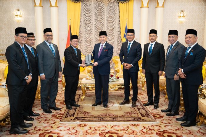KUCHING: Minister of Entrepreneur Development and Cooperatives, Datuk Ewon Benedick, led a delegation from Bank Rakyat for a courtesy visit to the Governor of Sarawak, Tun Pehin Sri Dr Haji Wan Junaidi Tuanku Jaafar, at Astana, near here today.