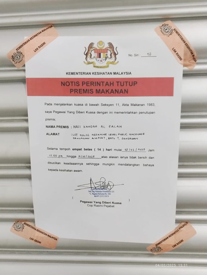 The closure order notice issued by KKM Sandakan could be seen posted on the front shutter of the restaurant, attracting much public attention.